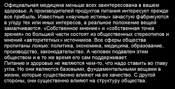 Задумайтесь… Врачи, медицинские учреждения, фармацевтика и тд и тп — ЭТО ВСЁ РУХНЕТ и будет просто не нужно!!! Вы сами подумайте сколько они делают на нас денег… на наших болезнях. Их цель — БОЛЬНОЕ население. А если все будут здоровы…тогда нужны будут только максимум травматологи. Подумайте сами. О врачах и смертоносном бизнесе — современной медицине. ПРОЧТИТЕ!!! - О врачах и смертоносном бизнесе — современной медицине. ПРОЧТИТЕ На счёт витаминов, всяких оксидантов, БЕЛКОВ и тд — забудьте. Объясняю почему. Уже давно установлено что наш организм сам СИНТЕЗИРУЕТ ВСЕ необходимые ему вещества! Синтезирует он их из клетчатки. Главное — что бы в него как раз и поступала сырая растительная клетчатка, в большом количестве. Как и положено природой! Содержится она в сырых фруктах, овощах, ягодах и тд. Но только в сырых!!! Обработка её уничтожает, разрушает!