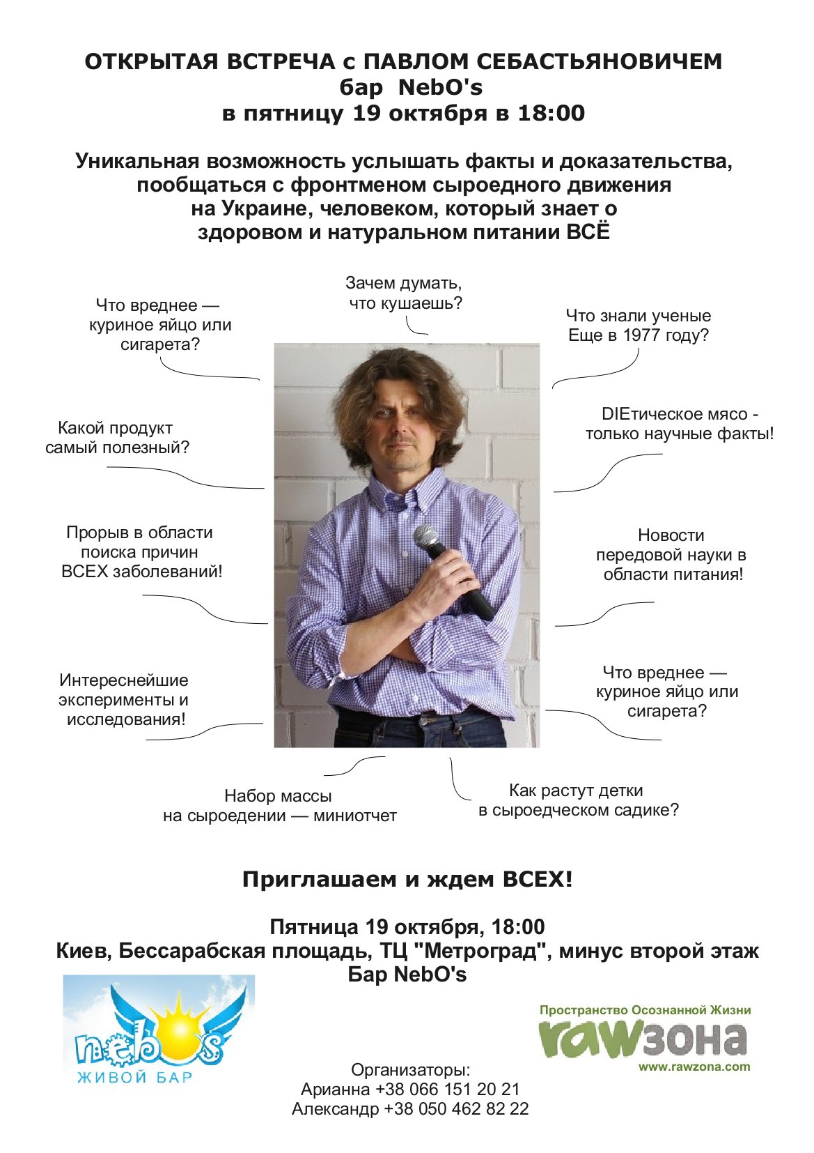 Бесплатная встреча c Павлом Себастьяновичем в баре НебО’S (Киев) «Новое в сыроедении и ответы на вопросы участников»Регистрация на встречу: Программа встречи:
